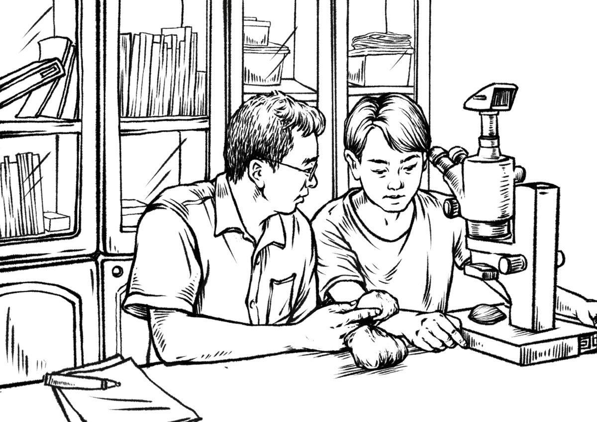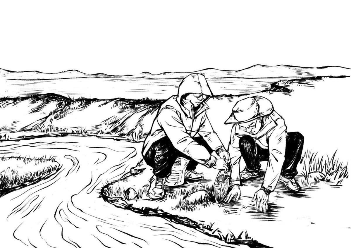 画稿中的所有人物,均以身边的师生为创作原型。“创作这个绘本的过程,也是我的思想接受洗礼的过程,我身边的很多老师和同学,为了探寻自然资源的奥秘,在野外风餐露宿、艰辛跋涉,真正地把论文写在祖国大地上。”参与创作的研究生唐钰君感叹道。