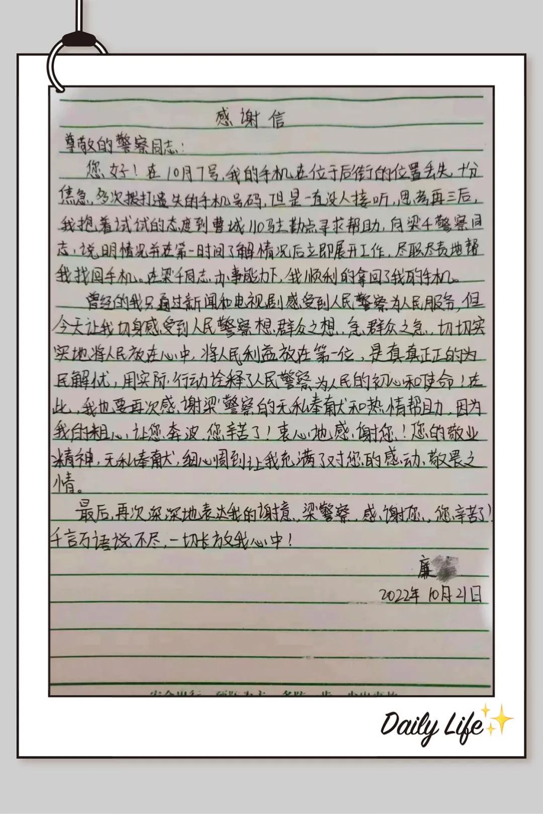 10月8日上午,小廉的母亲来到驻勤点将手机取回。10月21日,放假回家的小廉,回想起梁警官的尽职尽责,心中的敬意油然而生,便特意手写了一封感谢信,由此便出现了开头的一幕。