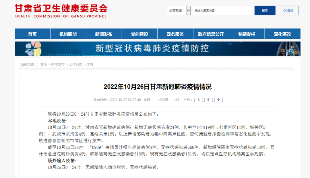 现将10月26日0—24时甘肃省新冠肺炎疫情信息公布如下: