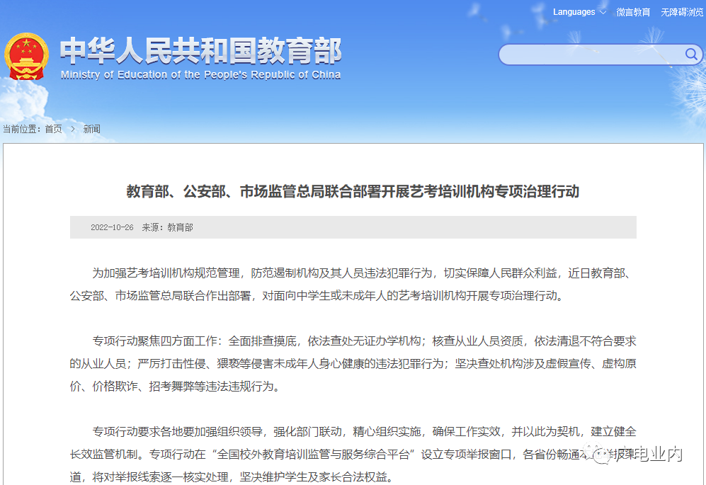 10月26日,教育部在官网发布消息,教育部、公安部、市场监管总局联合部署开展艺考培训机构专项治理行动。