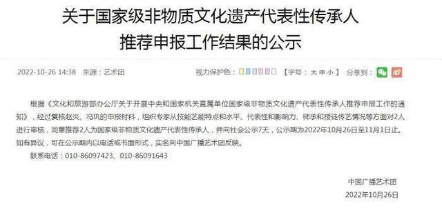 据国家广播电视总局官网26日消息,中国广播艺术团发布公示,根据《文化和旅游部办公厅关于开展中央和国家机关直属单位国家级非物质文化遗产代表性传承人推荐申报工作的通知》,经过复核赵炎、冯巩的申报材料,从技能艺能特点和水平、代表性和影响力、师承和授徒传艺情况等方面对2人进行审核,同意推荐2人为国家级非物质文化遗产代表性传承人,并向社会公示7天。