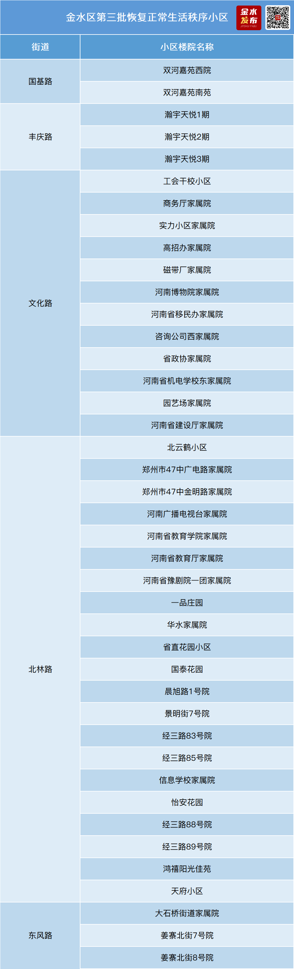 本轮疫情发生以来,在全区广大市民朋友的大力支持和积极配合下,金水区的疫情防控形势稳定向好、不断巩固。为尽早全面恢复全区正常生产生活秩序,根据当前疫情防控形势变化,经研究,决定有序恢复第三批居民小区的正常生活秩序。现通告如下: