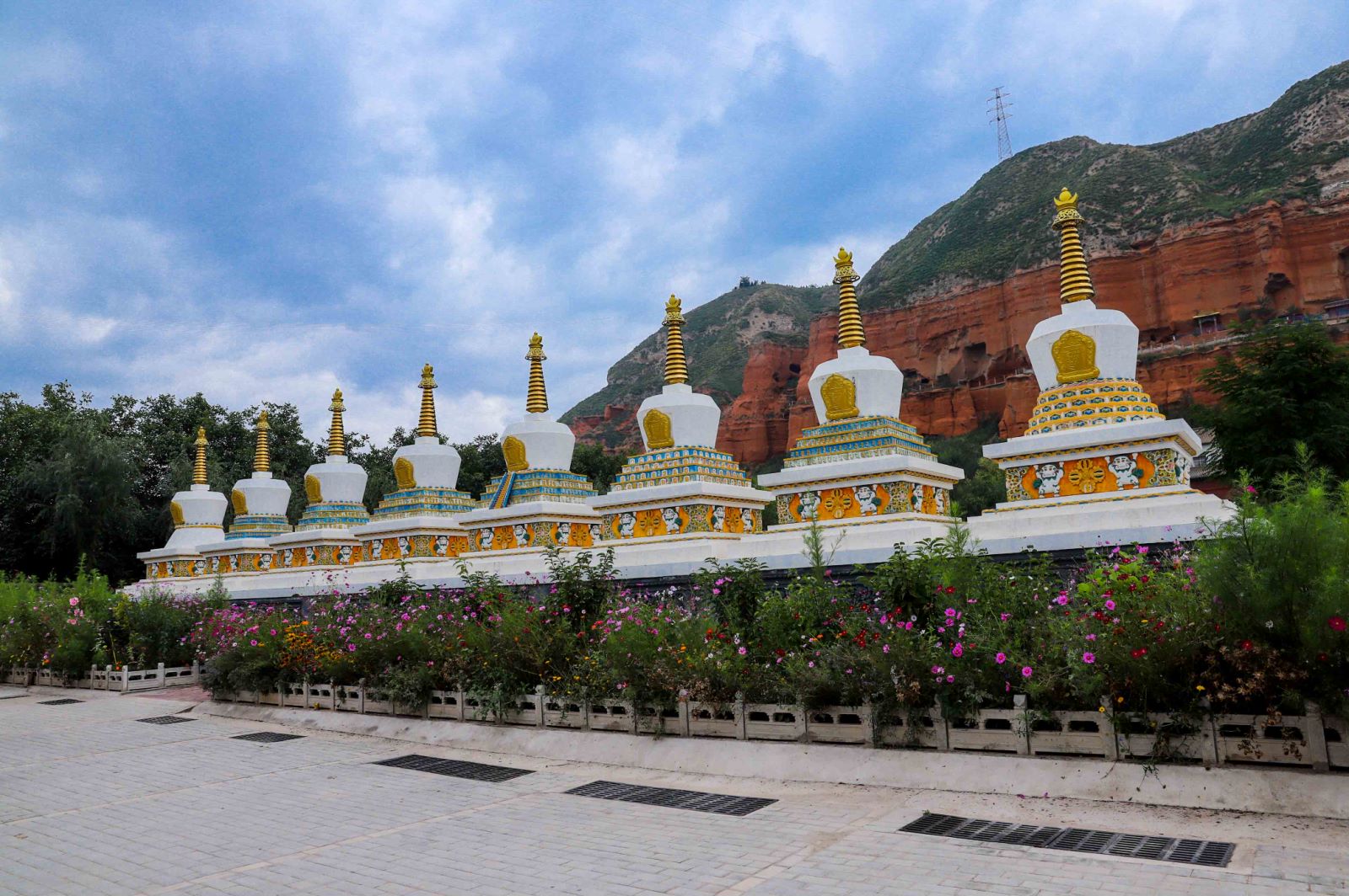 接近永靖县城时,发现路边一排白塔,这是我此行发现的第一座藏式佛教建筑,迅速拐入,里面的几处房子兼有汉藏特色,白塔一共八座,白墙金顶,辉煌大气,没看到标牌,不知道是什么所在,令人惊讶的是对面山崖山腰处居然还有一排悬空建筑,貌似有洞窟,中间有规模宏大的多层藏式大殿,甘肃全境自古有建造石窟的传统,不知道这里是何人修建,供奉的又是何方神圣?因天色已晚,有路人说里面已经关门了进不去,加上天色已晚,只有悻悻离去,实在是遗憾。