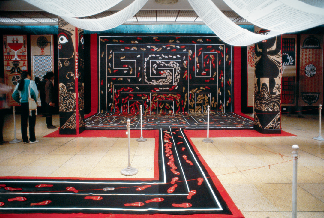 当时,他将中国美术馆变成了布满图腾图像的庙宇:脚印被悬挂在空中,不可辨认的文字组成剪影的样式。