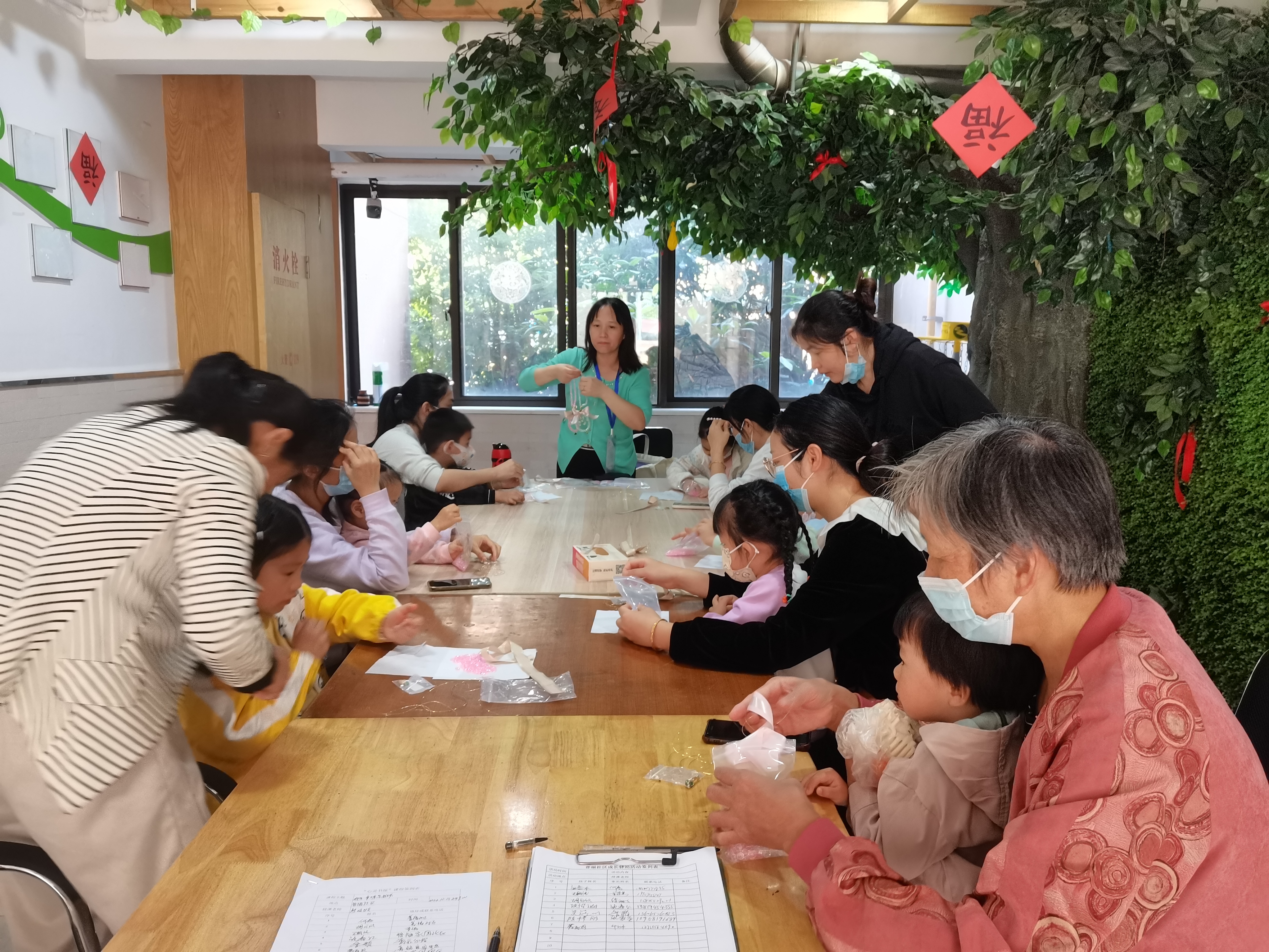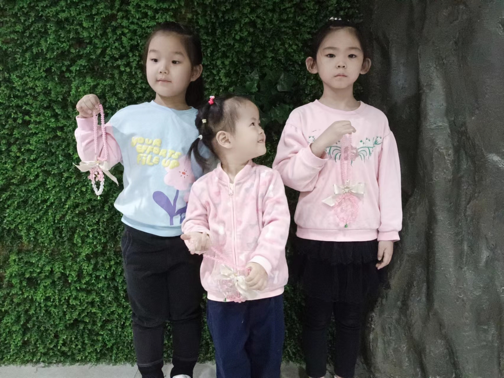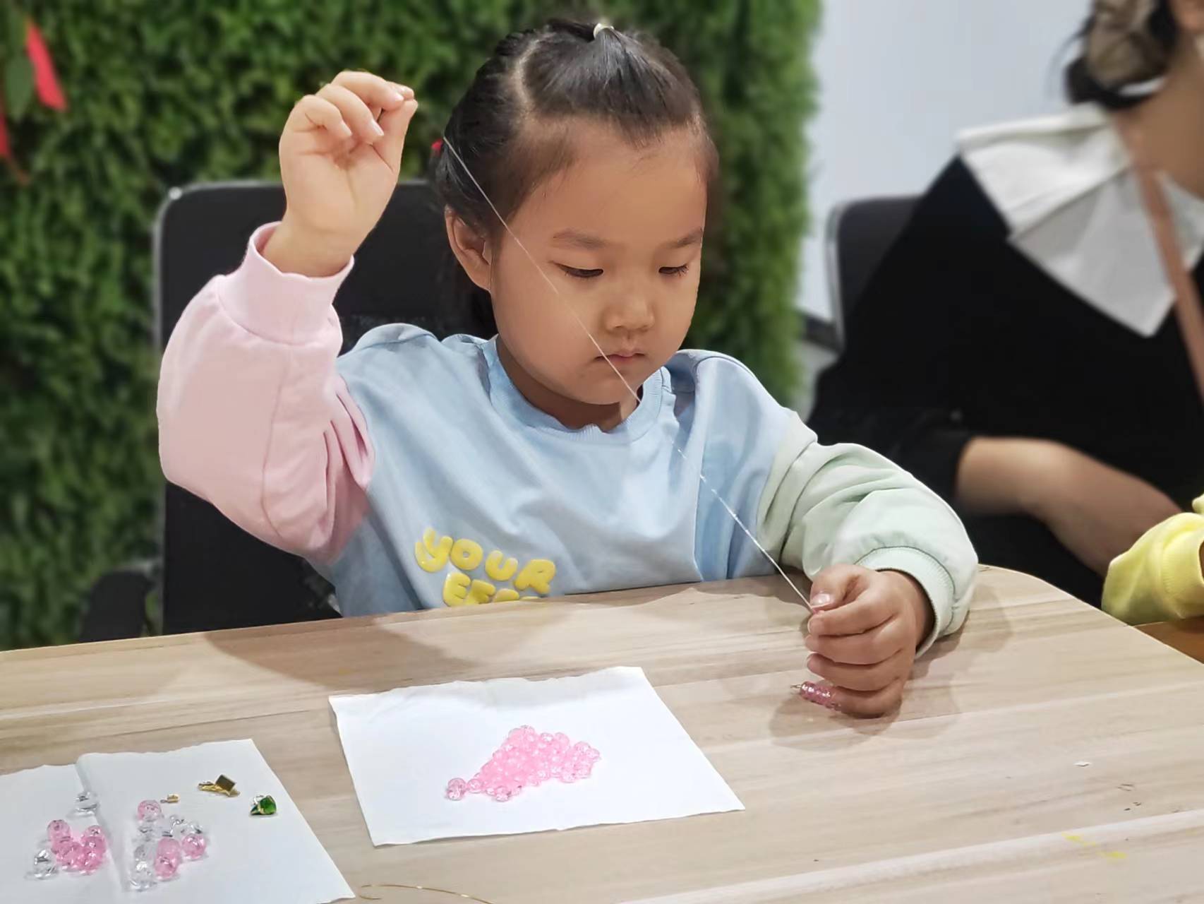 拈一粒晶莹剔透的珠子,穿过等待已久的丝线,缤纷多彩的珠子随着指尖流转。小朋友灵动的指尖与爸爸妈妈的配合,一个个漂亮的串珠车挂就伴随着居民们的欢声笑语诞生了。在制作的过程中,既培养了小朋友的色彩搭配能力,也促进了手眼协调精细动作发展能力。