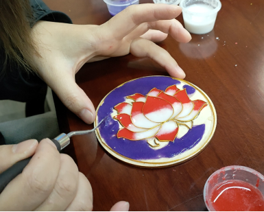 现场,老师首先向大家科普了掐丝珐琅的历史渊源、发展历程及工艺流程。在欣赏了一幅幅精美的掐丝珐琅画后,大家瞬间被这项传统工艺圈粉。在老师的指导下,大家从较为简单的、已勾勒好荷花图案的杯垫入手,先沿着图案轮廓涂上胶水,等待胶水晾干的同时进行掐丝。对初学者来说,掐丝这个环节十分具有挑战性,金属细丝需要在一弯一绕之间,勾勒出花朵雏形,并在画板上固定。不少居民在完成这一步后不由得长出一口气。随后就是给作品上色,大家搭配好彩砂颜色,用画铲将彩砂填入相应的区域。经过近一个半小时的时间,一朵朵栩栩如生的荷花作品终于出炉了。待成品完全晾干后,再涂抹一层固沙胶,所有工序才算真正完成。