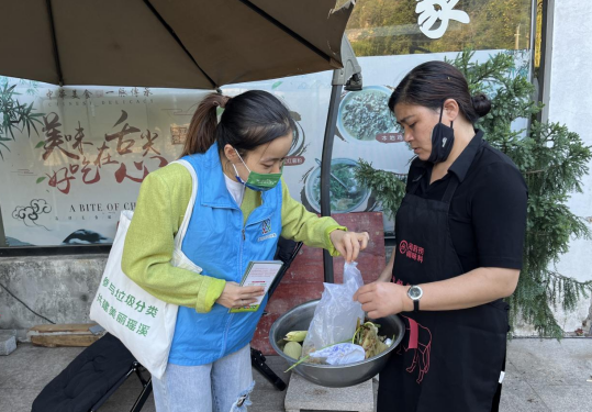 活动中,宣讲员耐心地向农家乐负责人宣传垃圾分类知识,通过发放垃圾分类宣传册、宣传品,引导大家阅读《浙江省生活垃圾管理条例》重点解读内容,了解垃圾分类的意义和法律责任,讲解厨房里面易腐垃圾和其他垃圾的分类知识,比如将剩菜剩饭、果皮、菜叶等放入易腐垃圾桶,将已污染的纸巾、一次性餐盒、破碎的陶瓷碗等放入其他垃圾桶内等。