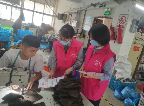 活动中,垃圾分类志愿者拿着垃圾分类宣传册走进生产车间,耐心细致地对每一位员工进行垃圾分类相关知识的宣传,同时对车间的原料废弃垃圾进行现场指导,其中的大部分皮革废料等都属于可回收物,通过资源实施回收再利用。而鞋面粘合强胶等属于有害垃圾,需单独存放单独处理。这种从垃圾产生的源头进行垃圾的分类,大大减少了垃圾再分类处理的工作量。