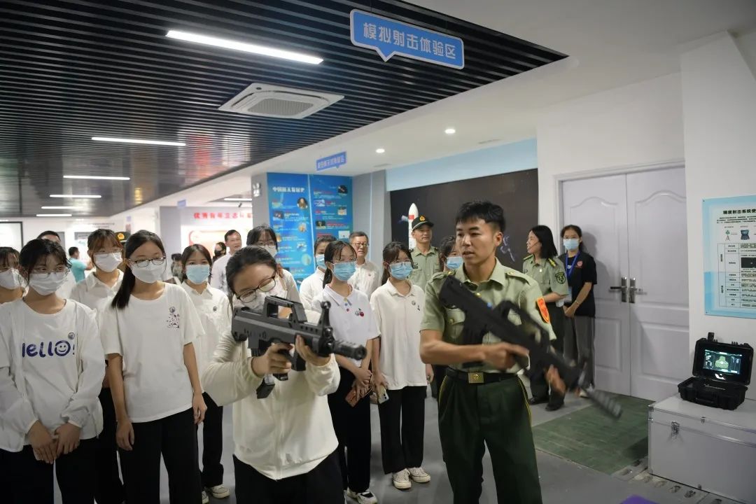 模拟射击体验区的同学们在退役大学生士兵的指导下开展活动