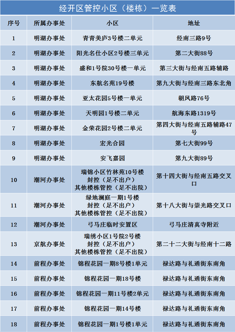 一、对明湖办事处青青美庐3号楼二单元等14个居民小区(共18个小区或单元楼栋)(具体名单附后),根据不同风险等级,分别采取“足不出户、服务上门”“足不出区、错峰取物”的分类管控措施,由党员、干部和社区志愿者点对点进行包联服务,实施精准管控,确保以最快速度扑灭疫情燃点、消除传播隐患。上述居民小区或单元楼栋解除管控的具体时间,由所在社区根据后续疫情防控形势变化,实时通知相关居民。