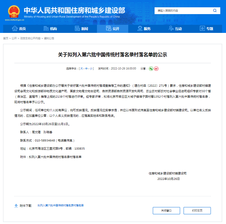 根据《住房和城乡建设部办公厅等关于做好第六批中国传统村落调查推荐工作的通知》(建办村函〔2022〕271号)要求,住房和城乡建设部村镇建设司会同文化和旅游部非物质文化遗产司、国家文物局文物古迹司、自然资源部自然资源开发利用司、农业农村部农村社会事业促进司组织专家对30个省(自治区、直辖市)推荐上报的2138个村落进行评审。经专家评审,拟将北京市密云区大城子镇墙子路村等1352个村落列入第六批中国传统村落名录,现将村落名单予以公示。