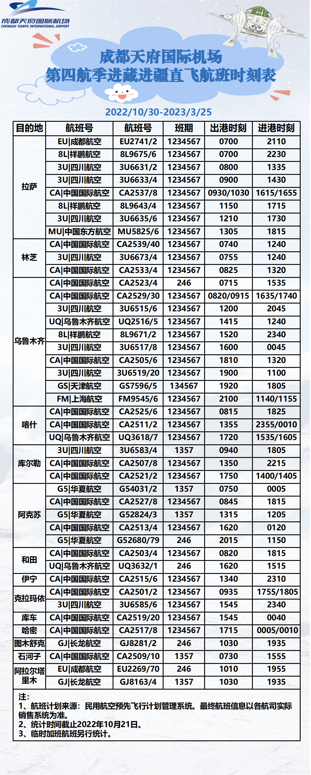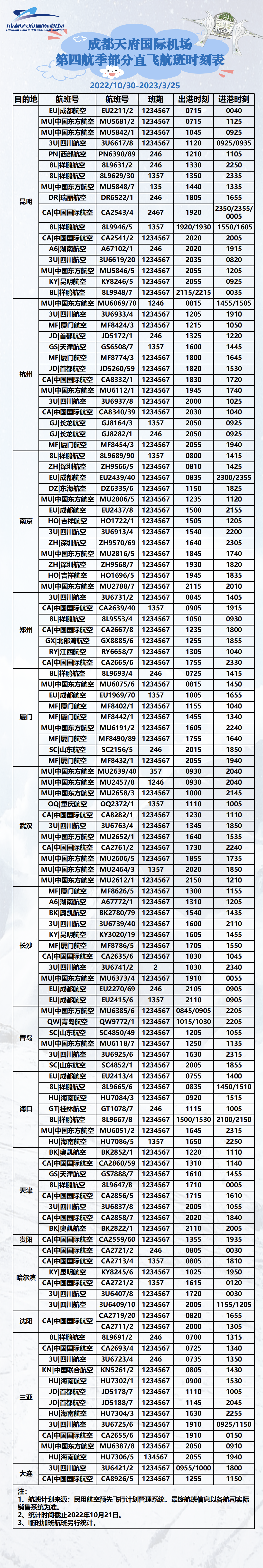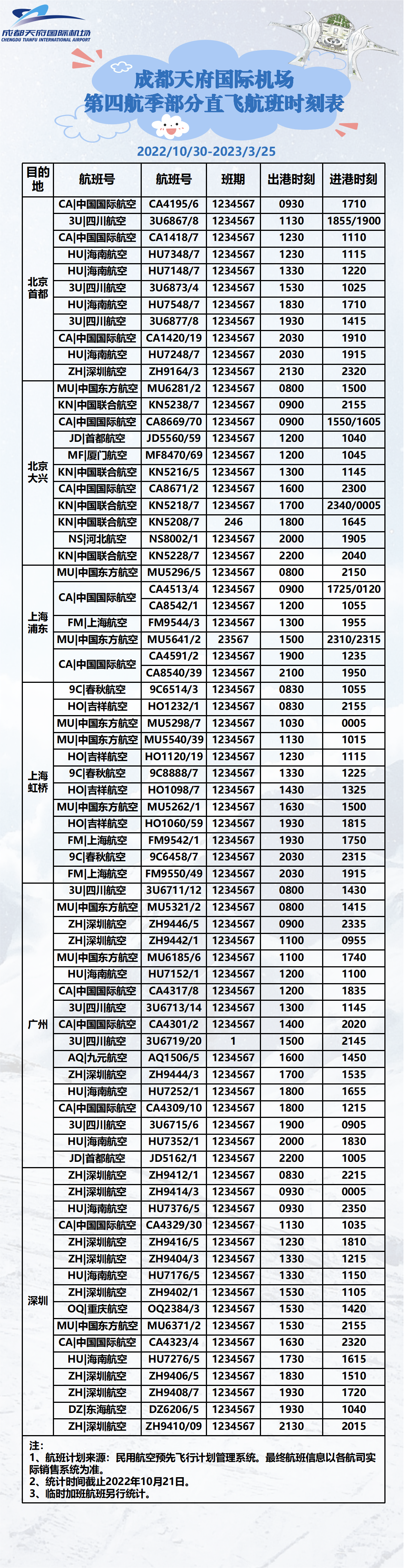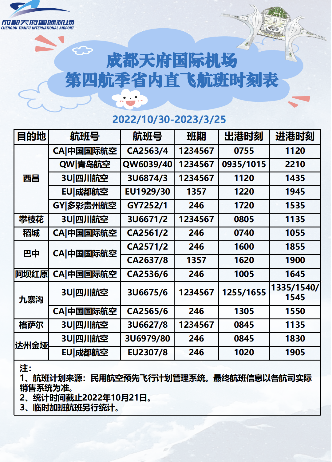 10月30日起,中国民航将执行2022年冬春季航班时刻。成都天府国际机场的航线将发生哪些变化?