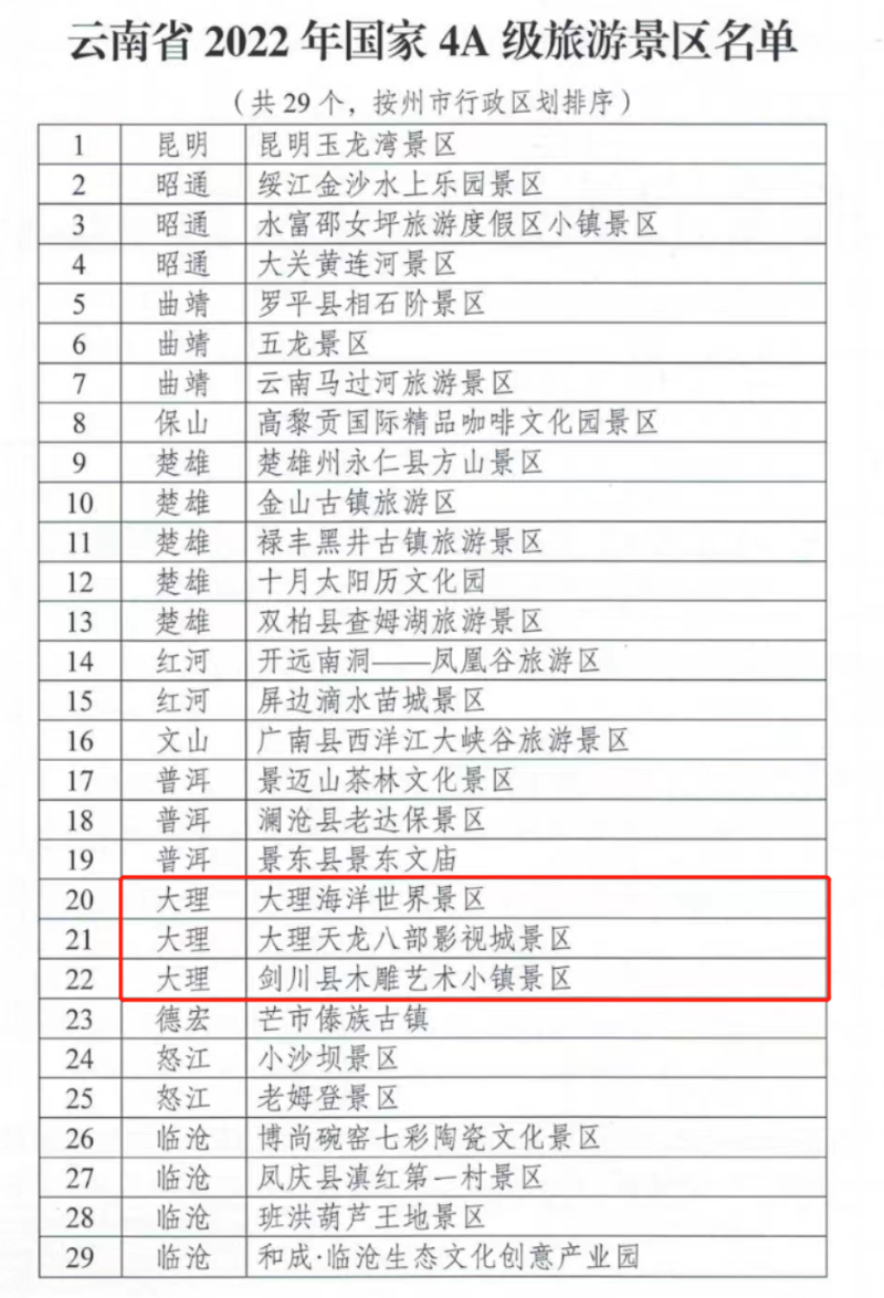 10月26日,云南省文化和旅游厅发布了关于确定29家景区为国家4A级旅游景区的通知,大理海洋世界景区、大理天龙八部影视城景区、剑川县木雕艺术小镇景区被正式确定为国家4A级旅游景区。截至目前,大理州共有国家A级旅游景区33个,其中5A级旅游景区1个,4A级旅游景区16个,3A级旅游景区15个,2A级旅游景区1个。