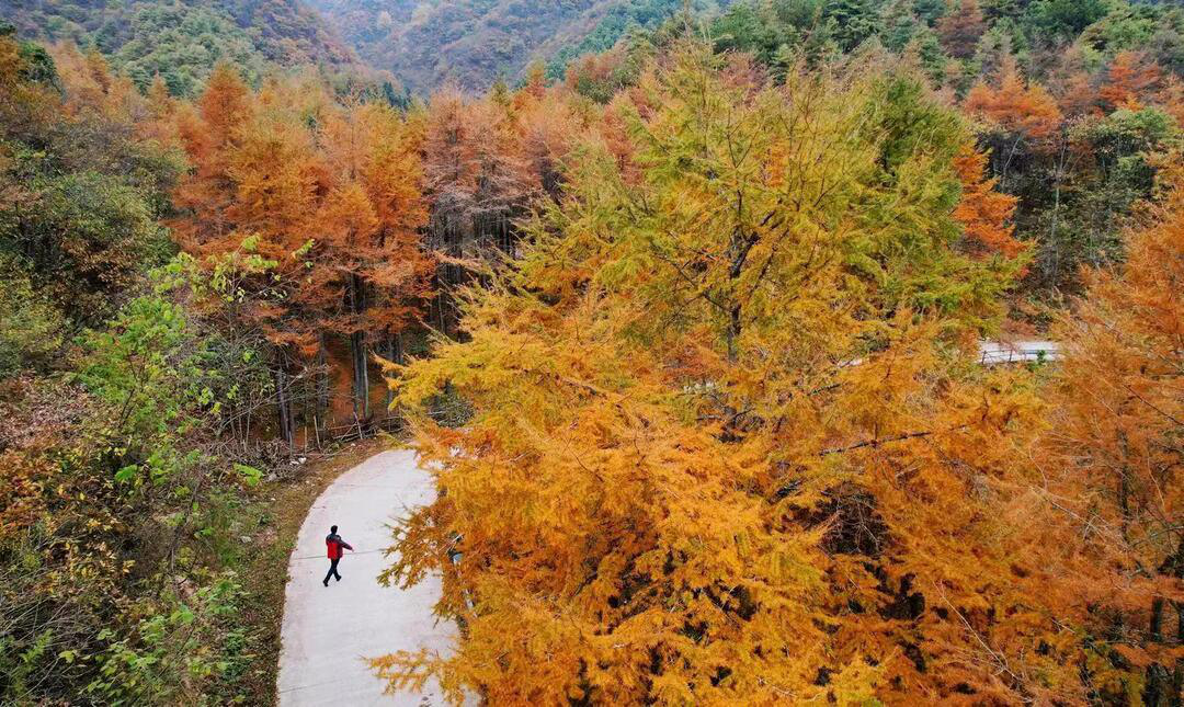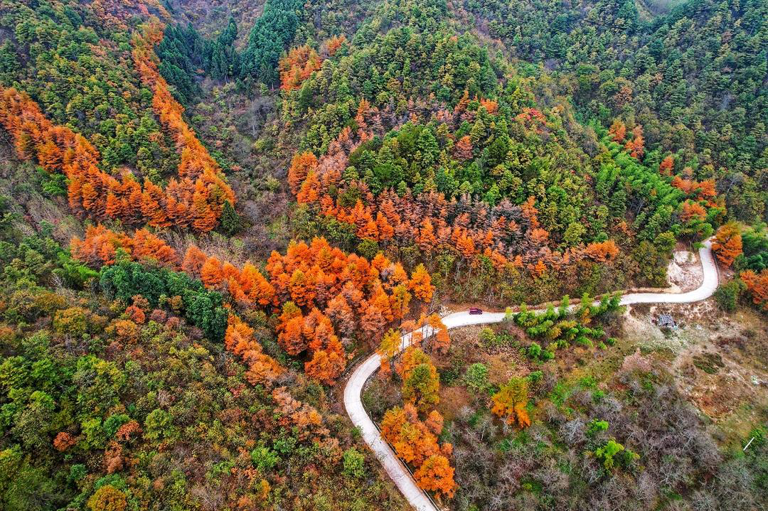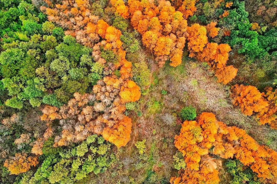从高空俯瞰,美景绵延数千亩,仿佛是镶嵌在绿色地毯上的花锦,五彩缤纷,格外惹人怜爱。火红的枫叶,灿黄的金钱松,酒红的水杉在温暖的阳光照耀下,一簇簇,一团团,熠熠生辉。