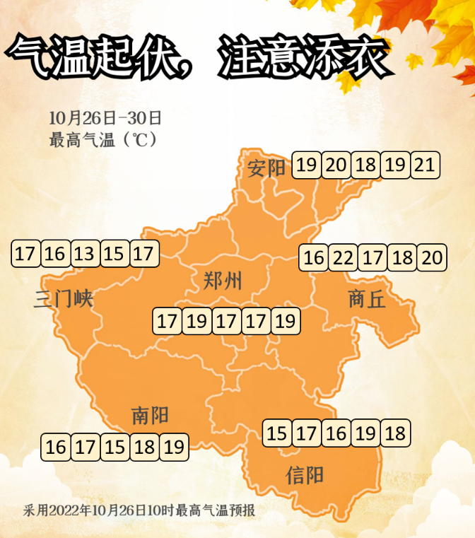 今天下午到夜里,三门峡、洛阳、南阳、平顶山、驻马店、信阳和周口南部阴天,有小雨或零星小雨;其他县市阴天到多云。明天,中西部、南部阴天,大部分县市有小雨或零星小雨,其中西南部局部有中雨;其他县市阴天间多云。28日,全省阴天间多云,中西部、南部部分县市有小雨或零星小雨。明天到28日白天,全省东北风3到4级,阵风6级左右。29到30日,西部阴天间多云;其他县市多云。31日,全省多云到晴天,偏北风4级左右。11月1日,全省晴天间多云。