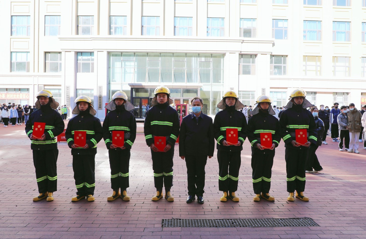 演练结束后,于长福为各二级学院选派退伍兵组建的学校义务消防队颁发聘书,松北区消防救援大队学院路救援站站长长张玉清为我校义务消防队授旗。