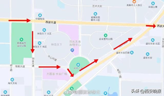 2022年10月27日中午12:00至2022年11月6日23:00,将对西部大道(创业大道-丽园路段)道路南半幅由西向东方向所有机动车道进行全封闭施工,剩余南侧辅道仅允许非机动车通行。施工期间,西部大道由西向东所有机动车(含公交车)可提前由硕士路或创业大道向南绕行至信息大道,后经过西沣路辅路返回西部大道。