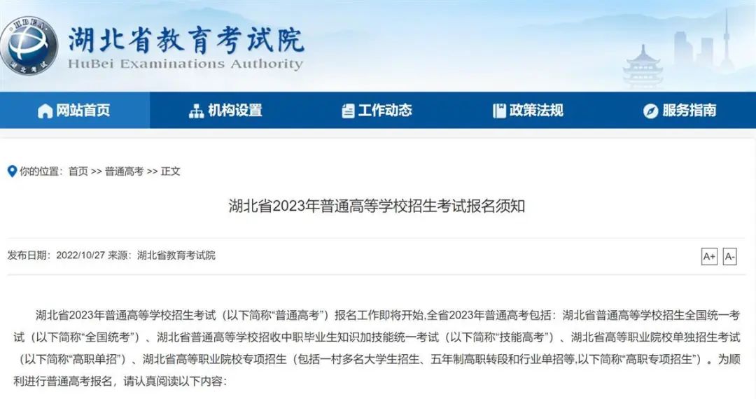 10月27日,湖北省教育考试院发布《湖北省2023年普通高等学校招生考试报名须知》(以下简称《报名须知》),对2023年普通高考报名工作进行了详细介绍。