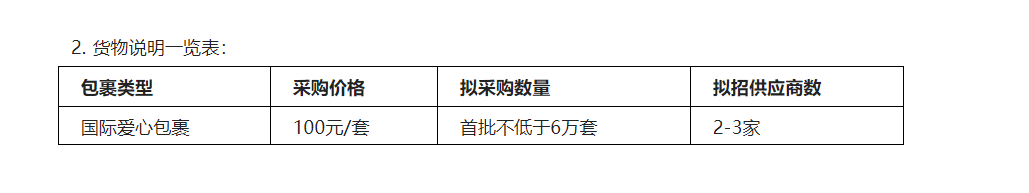3. 本次招标共分1包,竞标人须对1包进行竞标。中标人为国际爱心包裹项目2022-2024年供应商,凡招标人在合同期内向中标人采购国际爱心包裹项目下属货物,中标人应按竞标承诺提供分期分批供货。