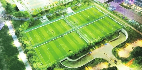 近日,市民在灯火通明的日照香河体育公园球场上健身。