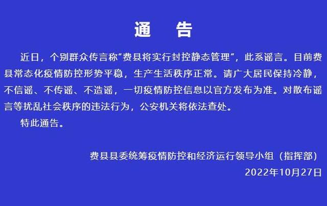 近日,个别群众传言称“费县将实行封控静态管理”,此系谣言。目前费县常态化疫情防控形势平稳,生产生活秩序正常。请广大居民保持冷静,不信谣、不传谣、不造谣,一切疫情防控信息以官方发布为准。对散布谣言等扰乱社会秩序的违法行为,公安机关将依法查处。