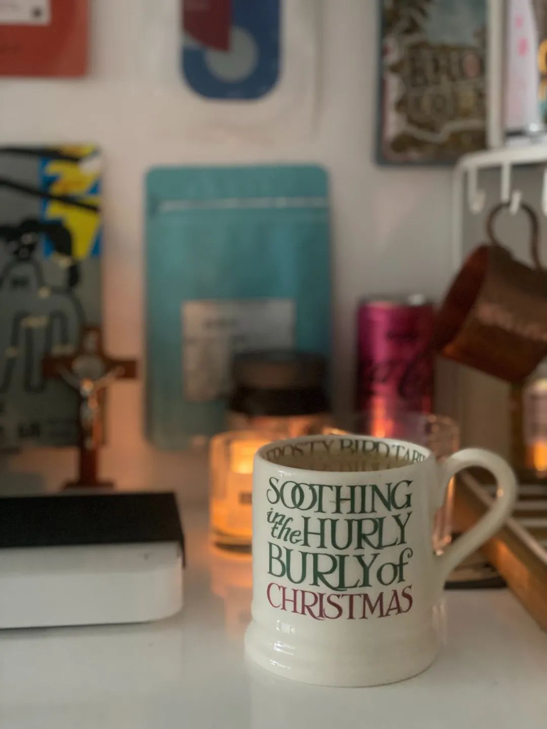 “睡了个懒觉起来泡的第一杯咖啡。”