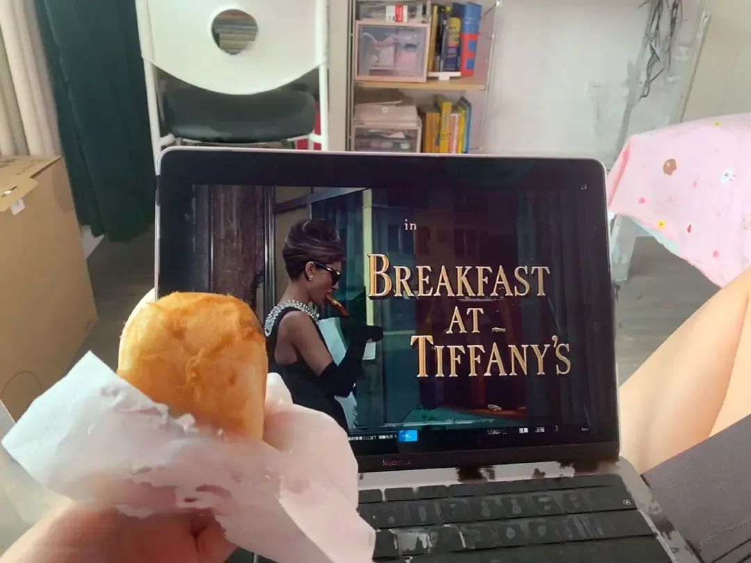 “一边看Tiffany‘s breakfast 一边早餐。”