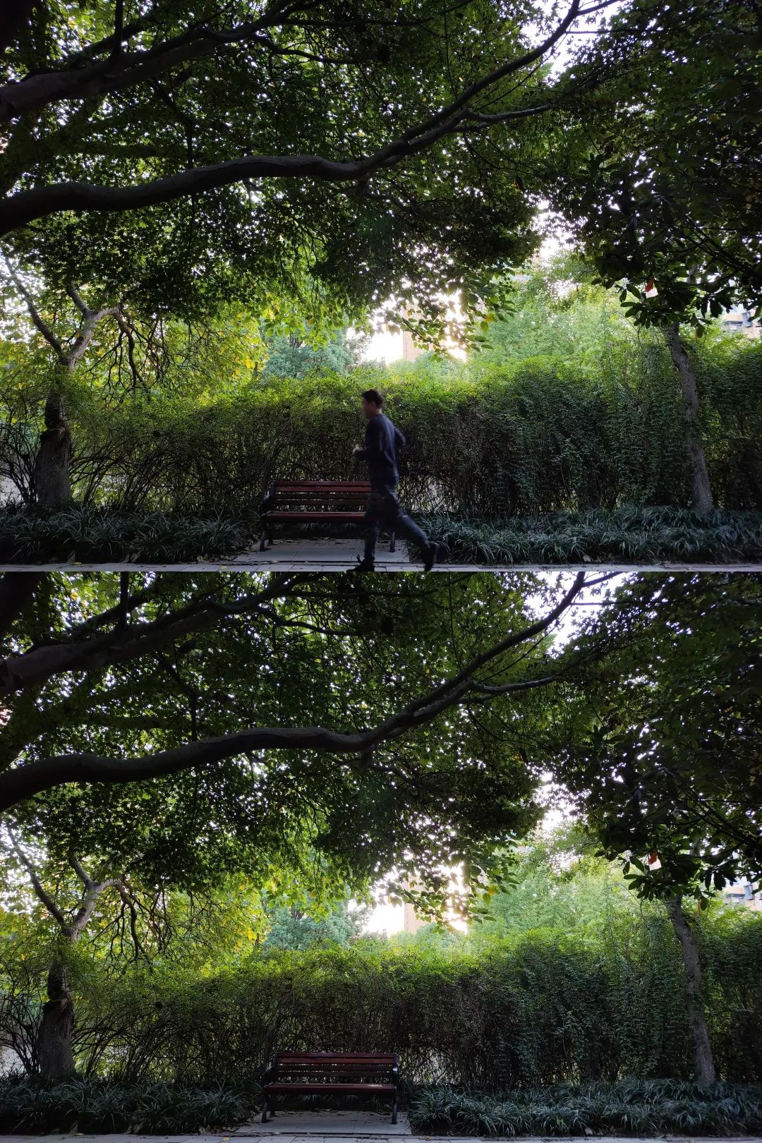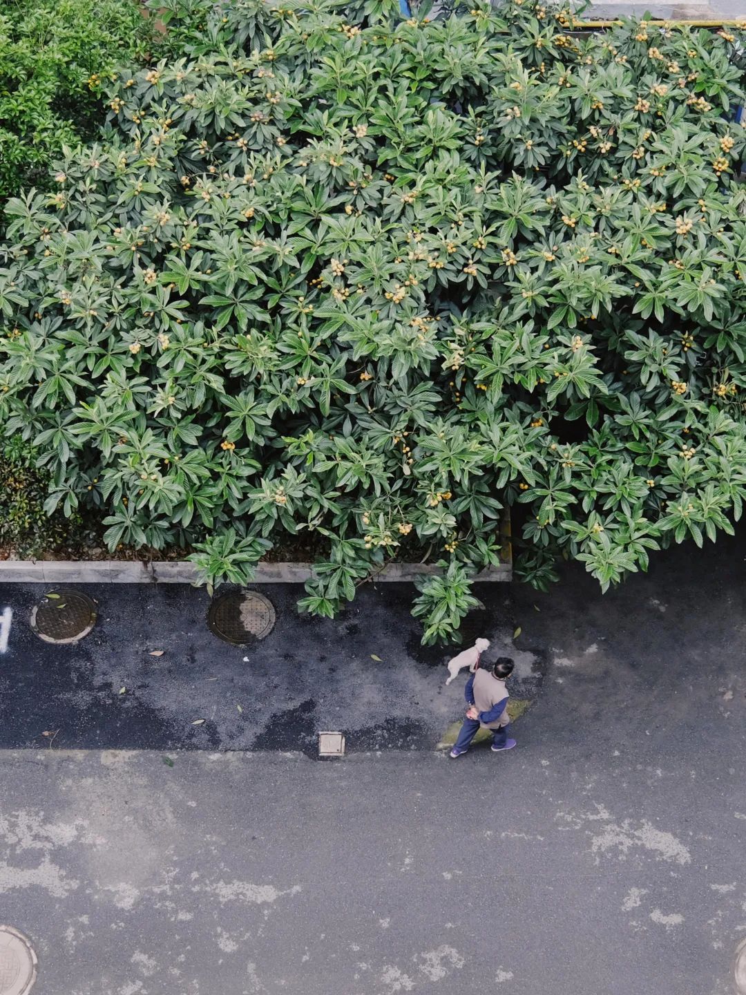 “租住在5楼,每天醒来的第一件事就是拉开窗帘看看楼下行人轨迹。对面楼的老人已经遛狗归来,仿佛是要钻进这一片绿色的洞穴,作为一个迷糊醒来的旁观者,被这一瞬间的诗意打动了,咔嚓一张。”