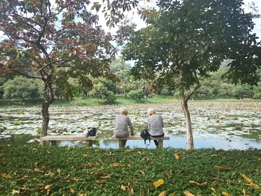 “广州的秋日,微风不燥,树叶微黄,但绿意仍然盎然。清晨的公园里,两位银发奶奶并排坐在湖边一个石凳上,望着一池残荷,时而轻声交谈,时而低头不语。她们应该是相识多年的老友记吧,甚至极有可能是感情深厚的闺蜜,瞧,她俩还穿着同样的条纹T恤呢。”