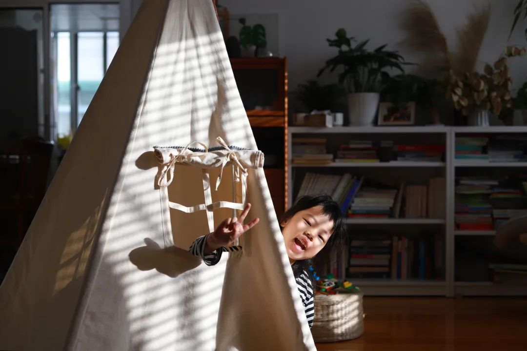 “这两天的早晨阳光忽隐忽现,妹妹起来迷迷糊糊的裹着小毯子钻到她最爱的帐篷里玩,转头看到阳光洒进来了很美的样子,赶紧拍下来。”