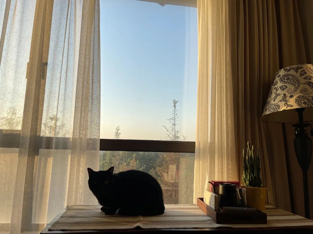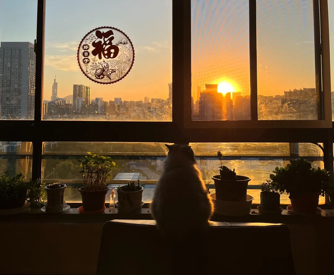 “周末的早上在晨光中给自己冲一杯咖啡,美好的周末开启。家里的黑猫叫梵高,2016年在小区楼下捡到时还不满月,养了六年了还是很胆小,不给抱。某天早上发现他趴着边桌上看日出,瞬间觉得好开心,原来你也喜欢啊。”