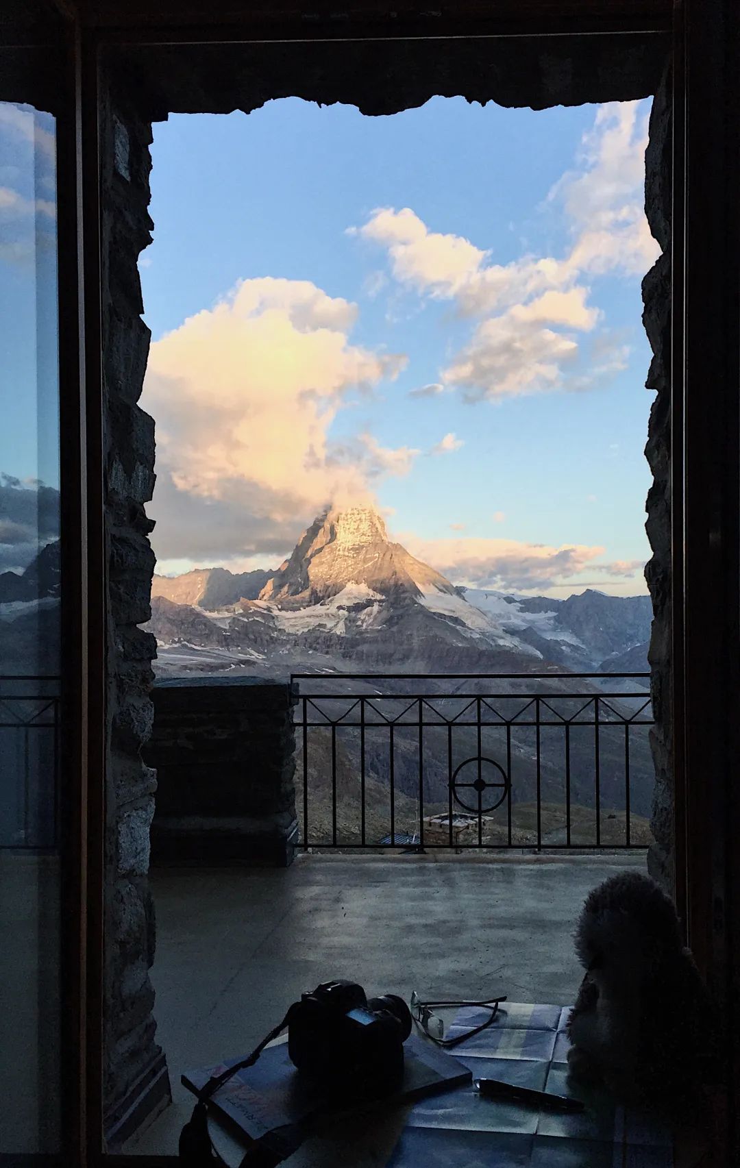 “和爱人在阳台一起等晨雾散开,马特洪峰逐渐清晰。”