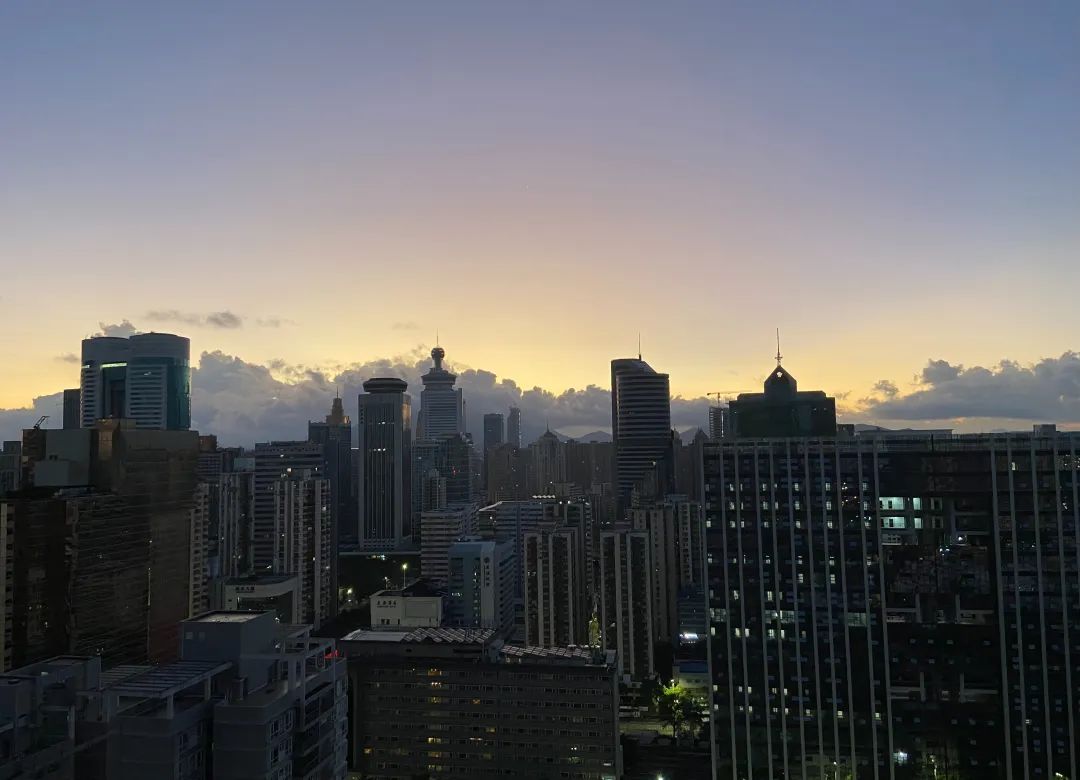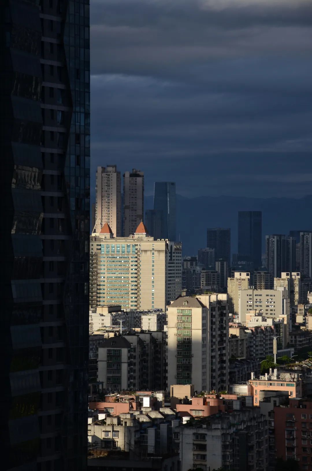 “台风来临的早上,从厚厚的云层里漏出一束阳光,照亮城市的角落。”