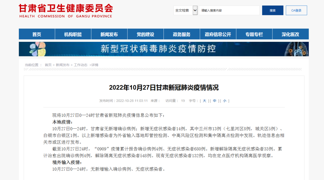 2022年10月27日甘肃新冠肺炎疫情情况