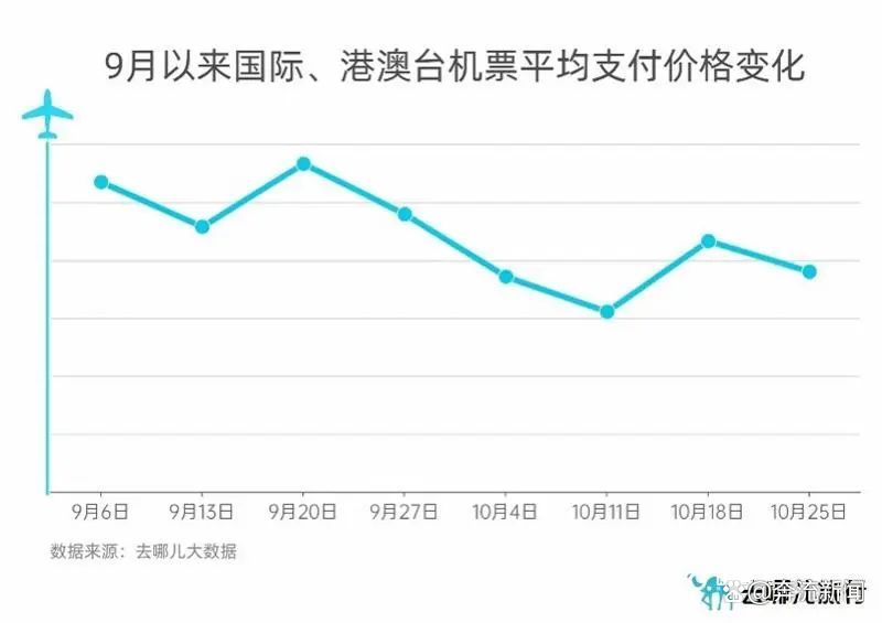 从机票价格来看,该平台国际航班机票平均支付价格自9月以来波动式下降,10月25日环比9月同期降低二成。平台大数据研究院院长兰翔表示,“若新增国际、港澳台航班飞满,则航班量接近2019年的20%。”