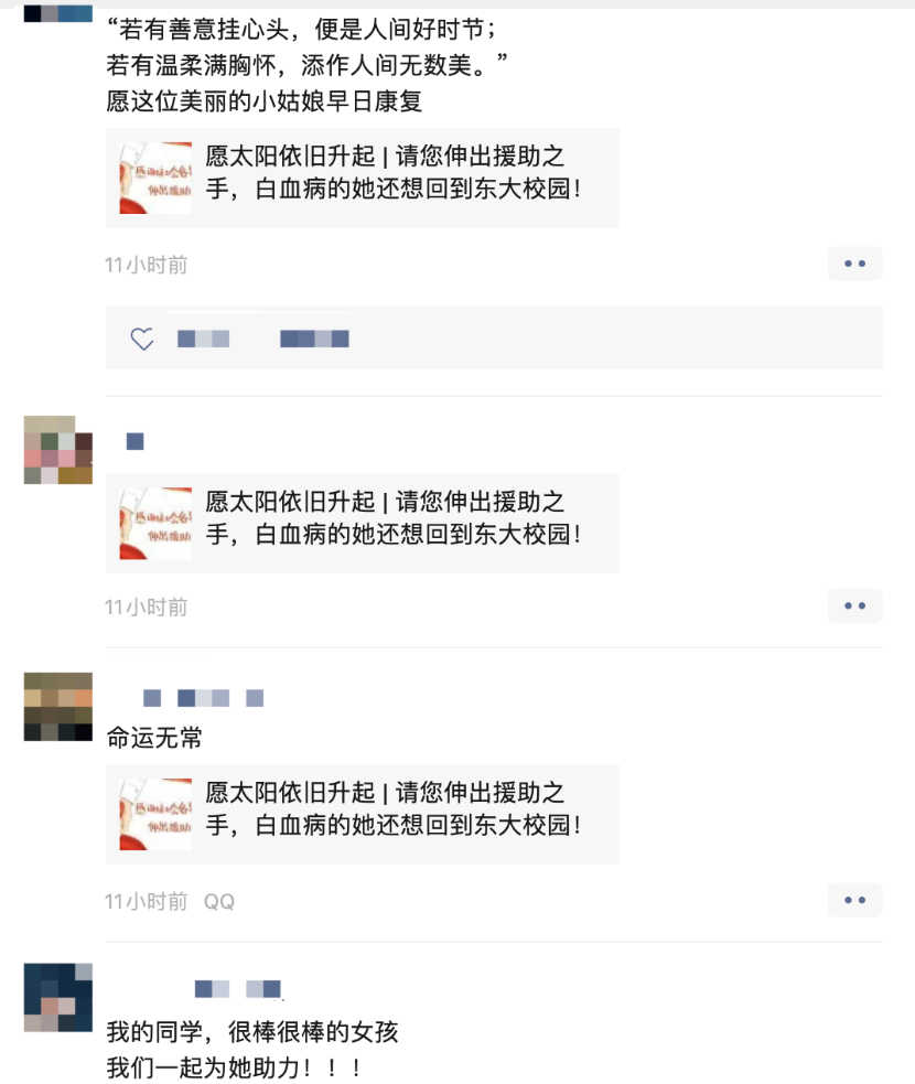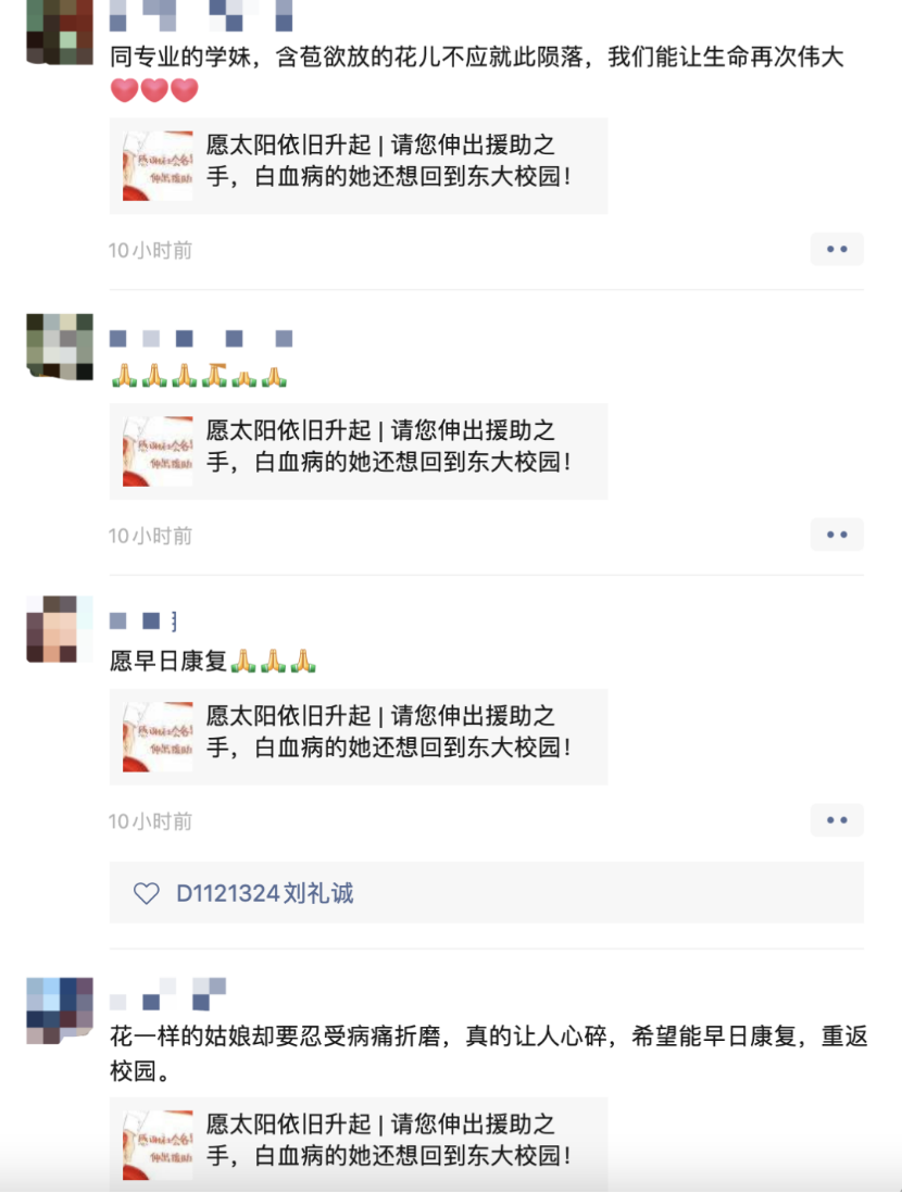 10月26日晚上11点13分,@东大信息公众号发出了《愿太阳依旧升起 | 请您伸出援助之手,白血病的她还想回到东大校园!》一文,紧接着,这条捐赠信息便在朋友圈刷屏。