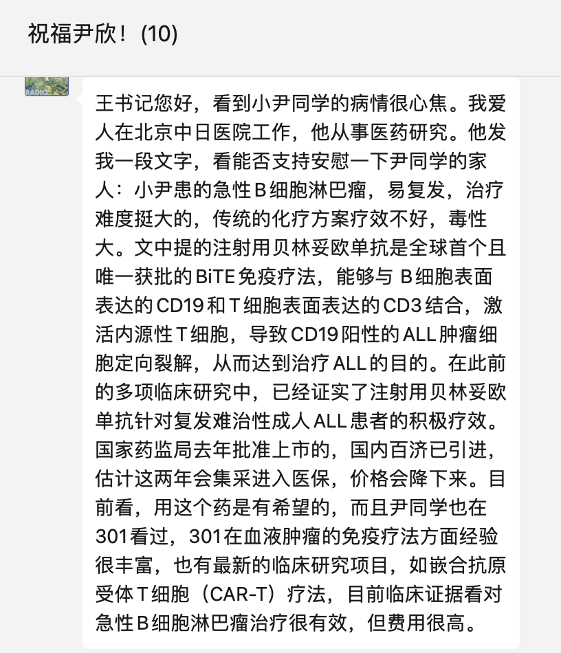 尹欣患病的类型很罕见,经过专家会诊,医生综合给出三个方案。万般抉择之下,尹欣及其家人决定使用贝林妥欧等进口药物化疗(费用初步预计150万,该方案存活时间较长)。妹妹的手术已经让家里入不敷出,如今更是雪上加霜。学院根据尹欣一级贫困生的情况,向学校和学院申请了大病救助金。学校教育基金会和学院平星基金立即启动救助程序,分别拨出5万元,在第二天就将10万元打入尹欣治疗账户。