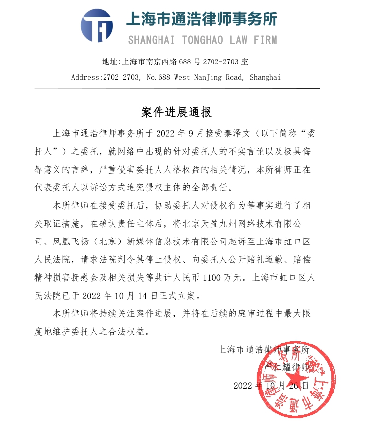 中新经纬10月28日电 “美女分析师出战世界小姐总决赛”后续来了。据上海市通浩律师事务所严仁耀律师处消息,今年9月该所接受秦泽文之委托,将北京天盈九州网络技术有限公司、凤凰飞扬(北京)新媒体信息技术有限公司起诉至上海市虹口区人民法院,请求法院判令其停止侵权、向委托人公开赔礼道歉、赔偿精神损害抚慰金及相关损失等共计人民币1100万元。上海虹口区人民法院已于2022年10月14日正式立案。