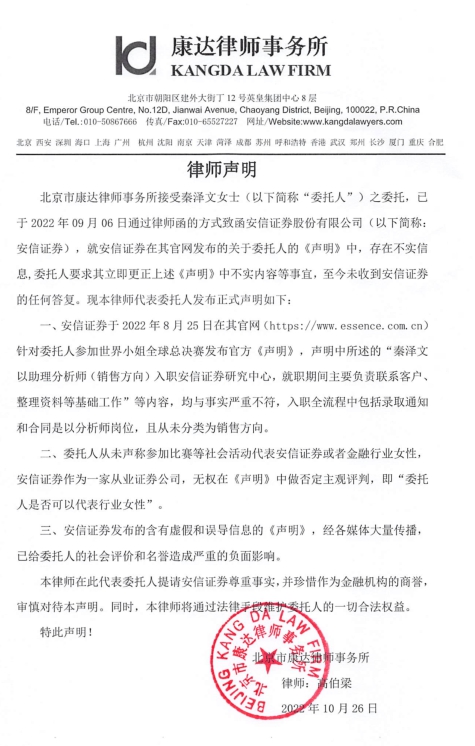 10月28日,北京市康达律师事务所发布声明称:“受秦泽文女士之委托,已于2022年09月06日通过律师函的方式致函安信证券股份有限公司,就安信证券在其官网发布的关于委托人的《声明》中,存在不实信息,委托人要求其立即更正上述《声明》中不实内容等事宜,至今未收到安信证券的任何答复。”