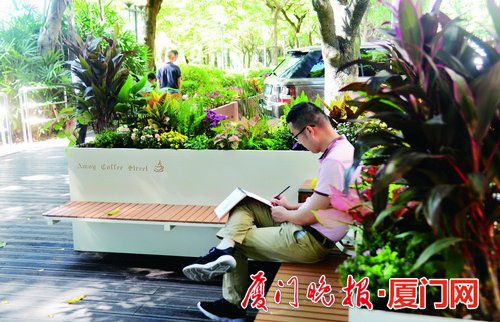 静坐时背靠繁花,内含咖啡拉花的立体绿化点题又灵动……近日,如果到“咖啡一条街”漫步,会发现这里的颜值又得到提升。10月初启动,历时半个月,位于筼筜路西段的花漾街区改造工程近日完工,思明区园林绿化中心在此处进行了原有花箱翻新、特色花箱设置及立体绿化节点营造等,让植物融入居民的日常生活,“近绿更可享绿”。