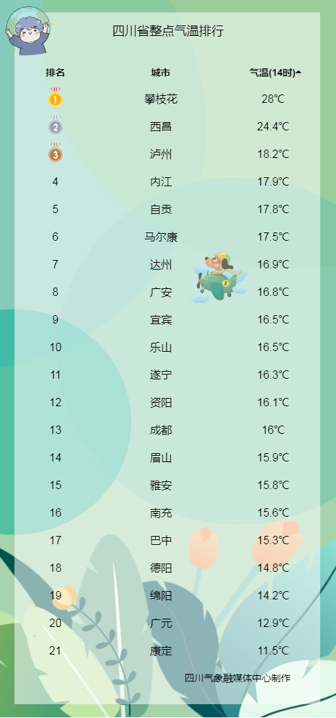 24小时内,盆地最低气温:12~15℃;最高气温:16~18℃。
