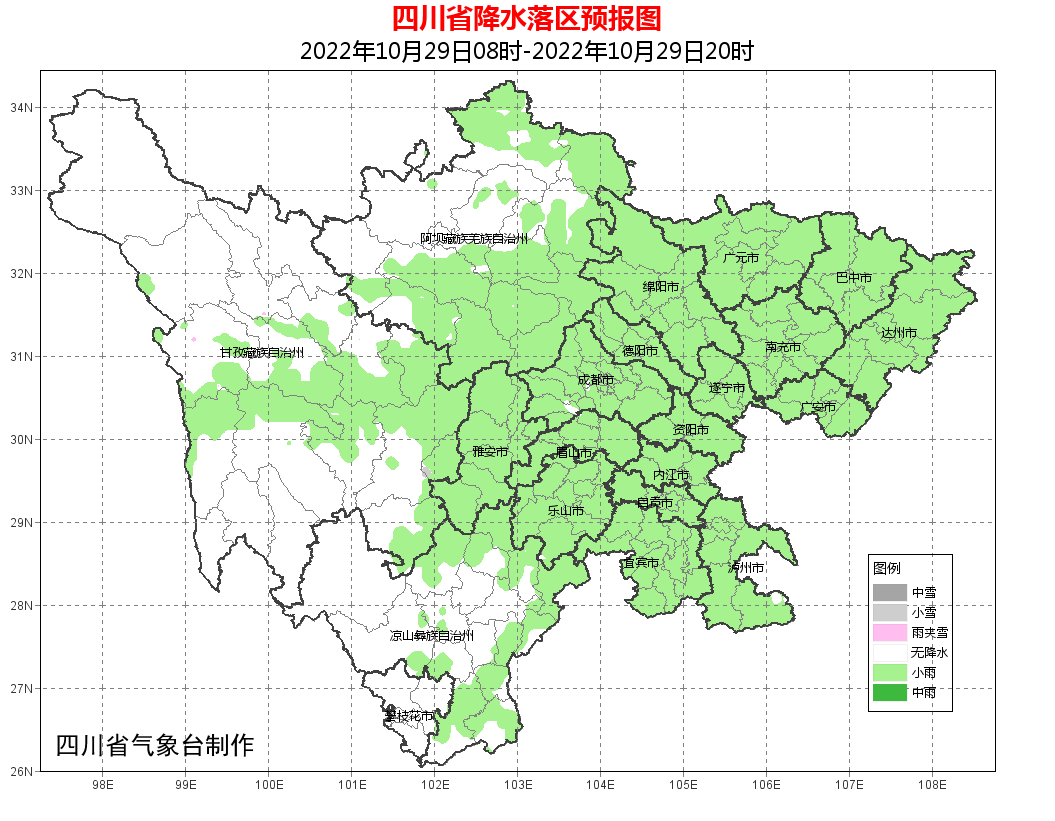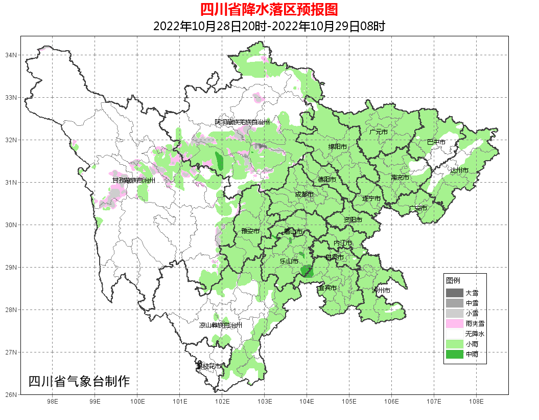 今天晚上:盆地各市阴天有小雨;川西高原北部多云间阴有分散阵雨(雪),川西高原南部多云间晴,攀西地区多云有分散阵雨。
