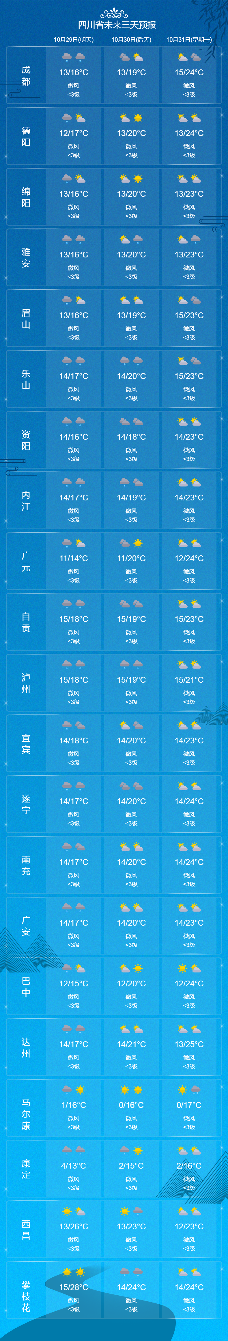 明天白天:盆地各市阴天有阵雨或小雨;甘孜州南部大部多云间晴,川西高原其余地方多云间阴有分散阵雨(雪),攀西地区多云有分散阵雨。