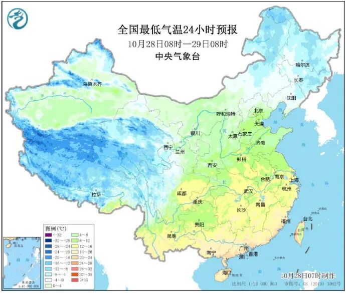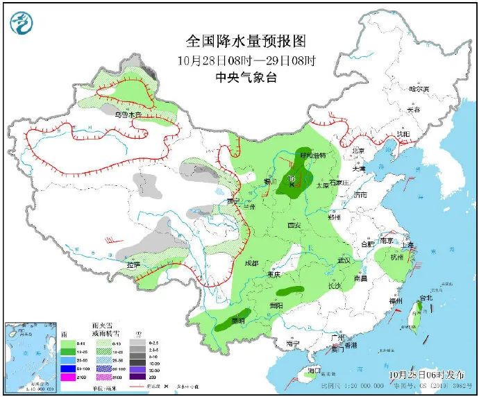 10月28日08时至29日08时,新疆北疆北部和沿天山地区、青海北部和东部、西藏东部、川西高原北部、甘肃中部等地部分地区有小到中雪或雨夹雪,局地大雪。内蒙古西部、北疆中部、西北地区东部、华北西部、黄淮西部、江淮西部、江汉、江南西北部和东部、西南地区大部、台湾岛东部等地部分地区有小雨,局地有中雨。内蒙古西部、西北地区东北部、江苏南部、浙江东部等地部分地区有4~6级风。东海西南部、台湾海峡、台湾以东洋面、巴士海峡、南海东北部和中东部海域将有7~8级、阵风9级的东北风。