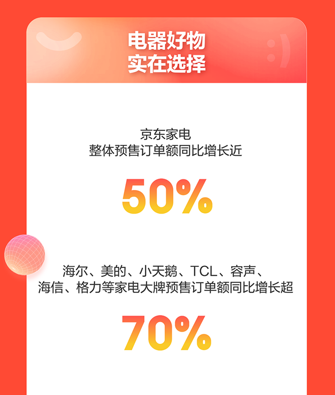 人们的舒适生活离不开家用电器。预售期间,消费者家电焕新热情高涨,家电整体预售订单金额同比增长近50%。海尔、美的、小天鹅、TCL、容声、海信、格力等家电大牌预售订单金额同比增长超70%。同时,“买多件”用户订单量同比增长超60%。