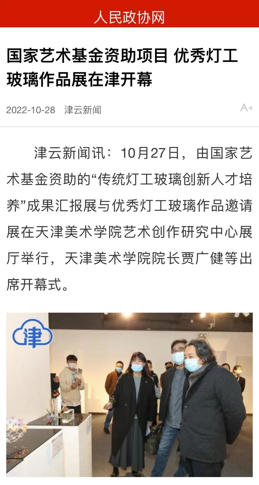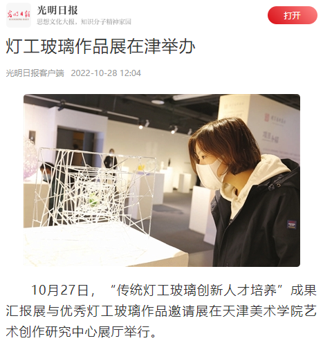 10月27日,由国家艺术基金资助的“传统灯工玻璃创新人才培养”成果汇报展与优秀灯工玻璃作品邀请展在天津美术学院艺术创作研究中心展厅举行,光明日报、人民日报新媒体、人民政协网、天津日报、天津电视台、津云等20余家权威媒体相继报道。