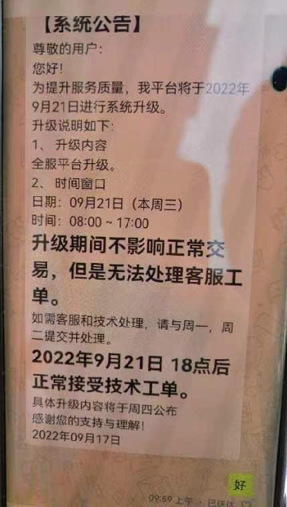 采访中,贺先生告诉记者,出现这种情况的导火索是9月10日那天,一位经常竞拍大额标价字画的会员没有参与,紧接着原有的竞拍秩序失序,而此时不少会员已花大额抢拍了字画在手里。在事发几日后,群里突然又发布了“9月21日系统升级”的提醒,提醒中称“升级期间不影响正常交易,但是无法处理客服工单”。不过竞拍者没等到系统升级,后来连平台的链接也打不开了。
