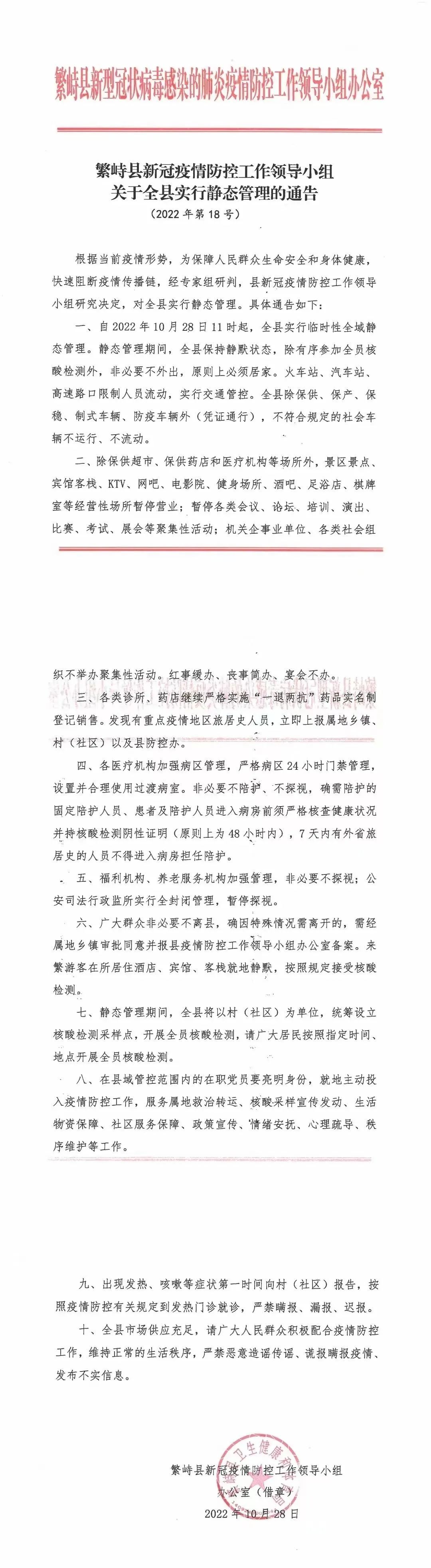 2022年10月28日,繁峙县在对全员核酸样本检测时检出初筛阳性18例。现将有关情况公布如下: