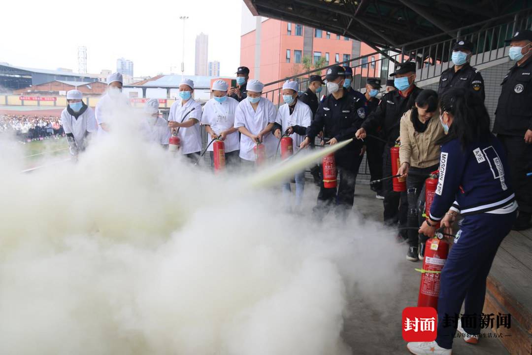 原来这是一场由临江派出所联合消防共同带来的消防紧急疏散演练。在演练结束后,临江派出所民警还为全体师生带来了消防安全理论知识讲解。为保证师生能更好地吸收消防安全知识,临江派出所民警现场进行了灭火器规范操作使用展示。