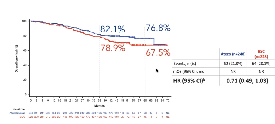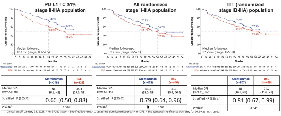 研究设计:受试者均为完全切除的早期NSCLC患者,接受手术且恢复后入组。所有患者均接受化疗,按1:1的比例随机分为两组,分别接受阿替利珠单抗治疗或者最佳支持治疗(BSC)。